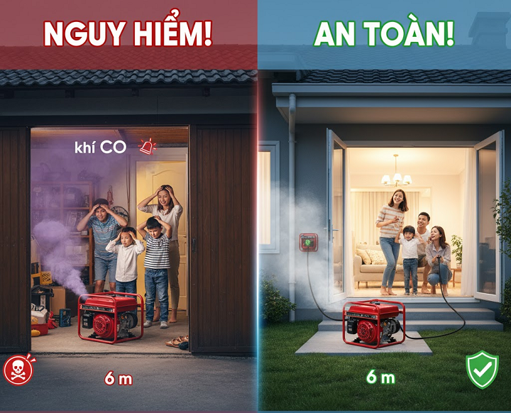 Chính vì vậy, việc đặt máy phát điện trong nhà, trong gara, tầng hầm hay bất kỳ không gian kín nào, dù chỉ một thời gian ngắn, cũng tiềm ẩn rủi ro rất lớn. Khí CO sẽ nhanh chóng tích tụ đến nồng độ cao, gây ảnh hưởng nghiêm trọng đến những người trong khu vực đó.