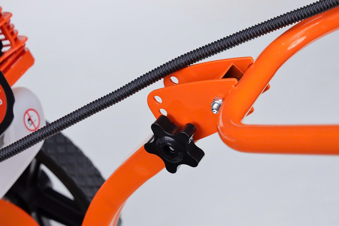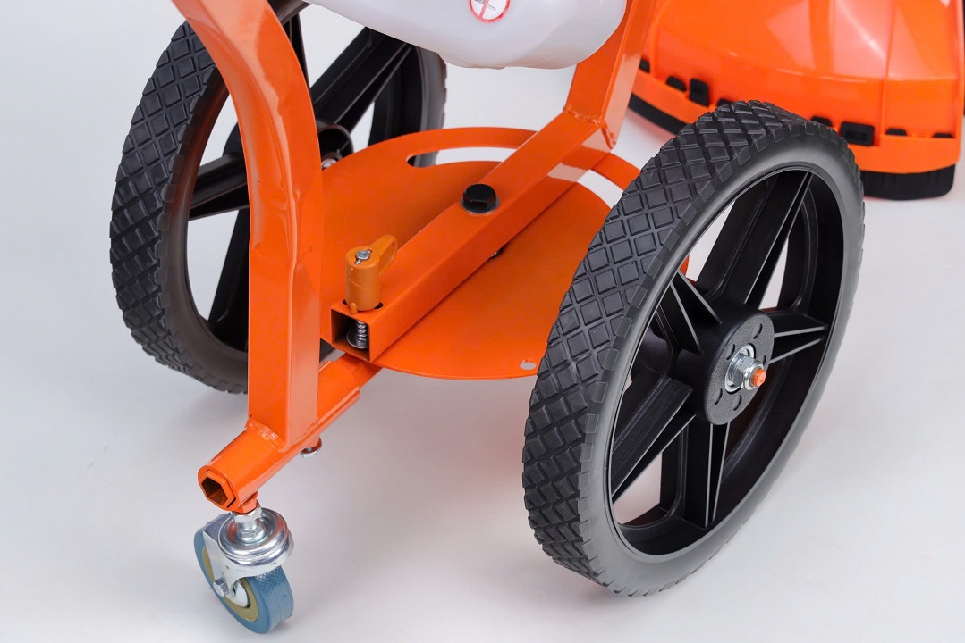 – Người dùng có thể cắt cỏ ở mưc độ cao thấp tùy ý mà không cần dùng lực mạnh nhờ bánh xe đỡ phía sau. Cùng 2 bánh xe đẩy bằng hơi to, giúp đẩy nhẹ nhàng.