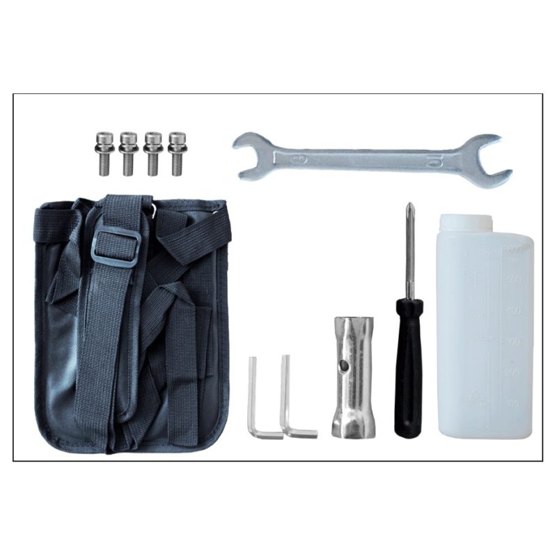 Bộ phụ tùng dụng cụ bao gồm : 1 bình pha, 1 dây đeo và pas gắn dây đeo 1 cái, 1 lưỡi cắt cỏ (305mm x 90mm x 25,4mm x 1,6mm), 1 chắn cỏ, 1 tay cầm trái và 1 bịch phụ tùng (bulon, lục giác, lục giác 4 – 5, khóa mở bugi).