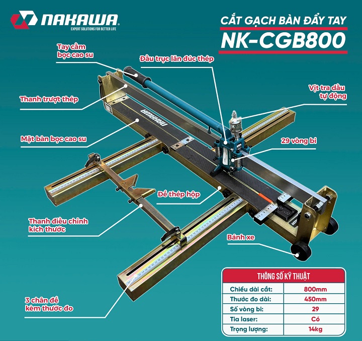 Máy Cắt Gạch Bàn Đẩy Tay Nakawa NK-CGB800 có thể dùng để cắt gạch lát nền, gạch ốp tường, gạch bông, gạch đá hoa cương, gạch men,… một cách dễ dàng, nhanh chóng và nhất là đường cắt đẹp, chính xác đúng như ý muốn của người cắt góp phần hoàn thiện các công trình dây dựng, ốp lát,…