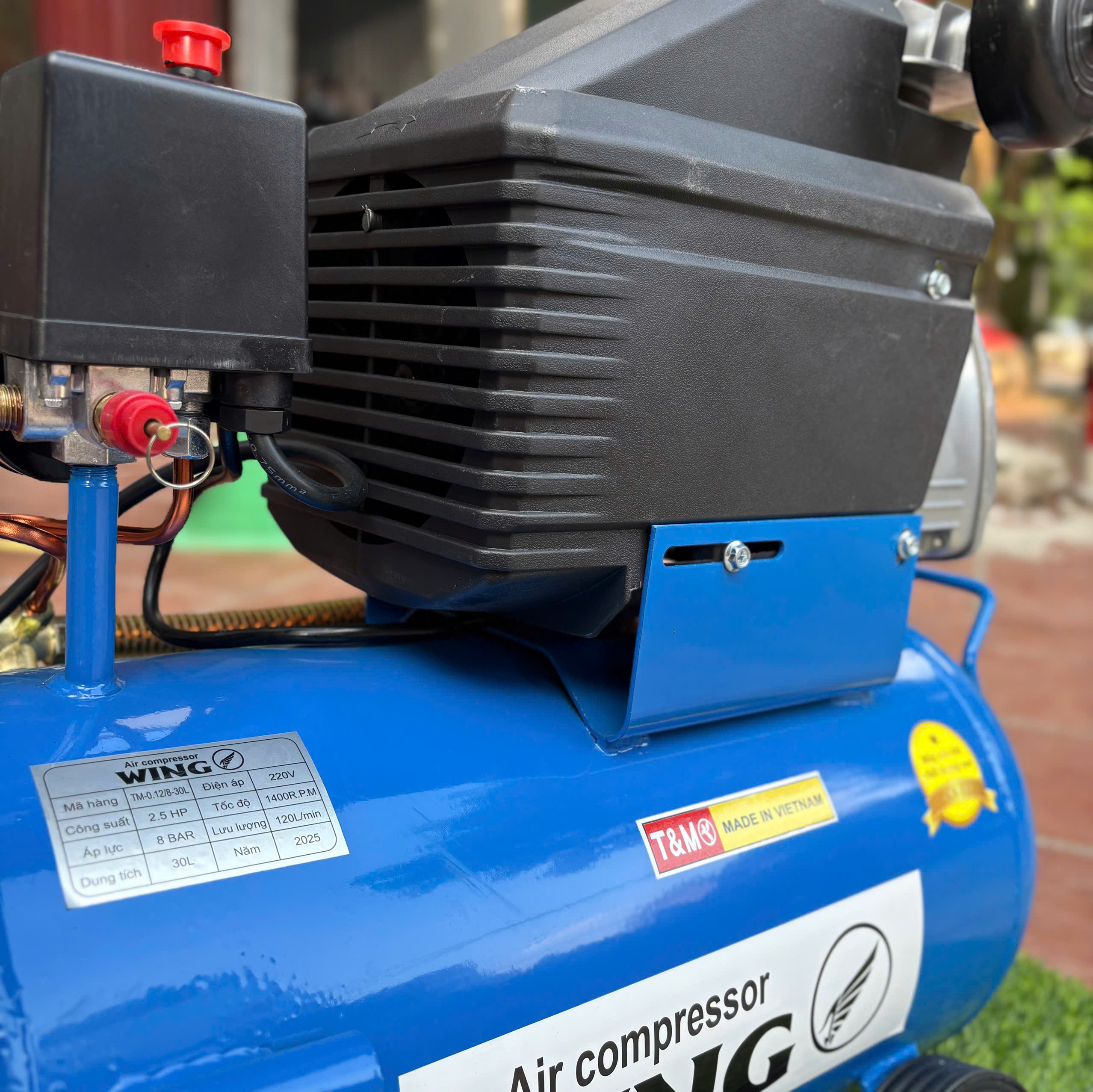 –Máy Nén Khí Có Dầu TM-0.12/8-30L WING 2.5HP có công suất hoạt động 1.5 HP, dung tích bình 25L. Máy được trang bị mô-tơ dây đồng có độ bền cao, áp lực khí nén lên tới 8 kg/cm² giúp làm việc hiệu quả, ổn định khả năng dẫn nhiệt và dẫn điện tốt.