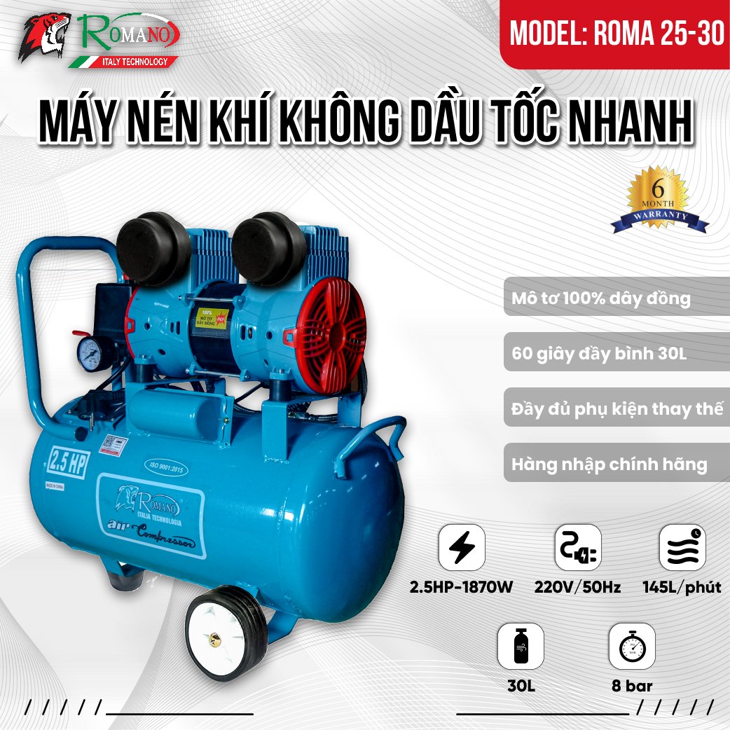 Máy Nén Khí Không Dầu 2.5HP Romano ROMA25-30 30L Lên Hơi Nhanh