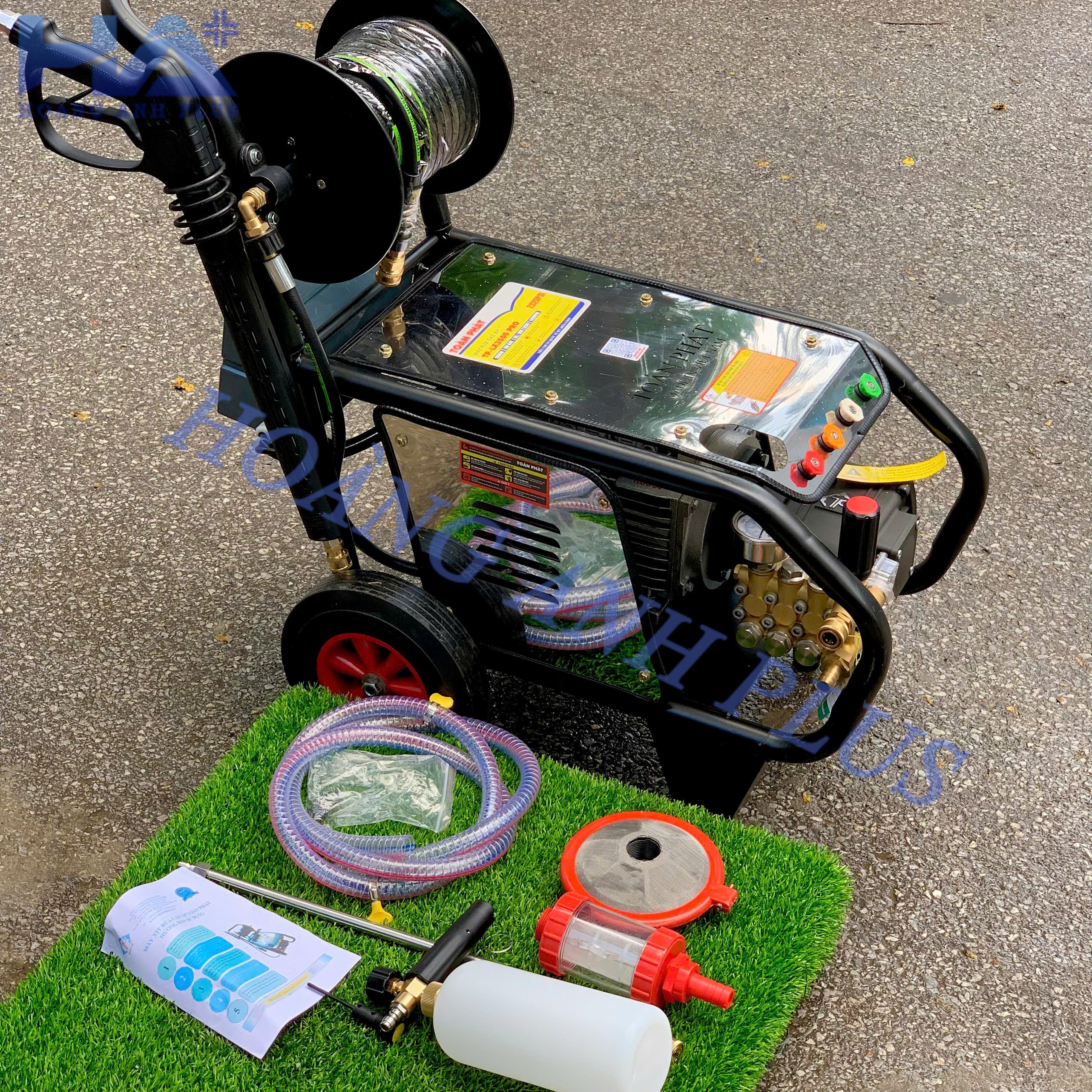 Phụ kiện : lọc rác, dây hút 2m, dây cao áp 15m, súng cao áp, thanh nối dài, 4 béc phun , bình bọt 1L.