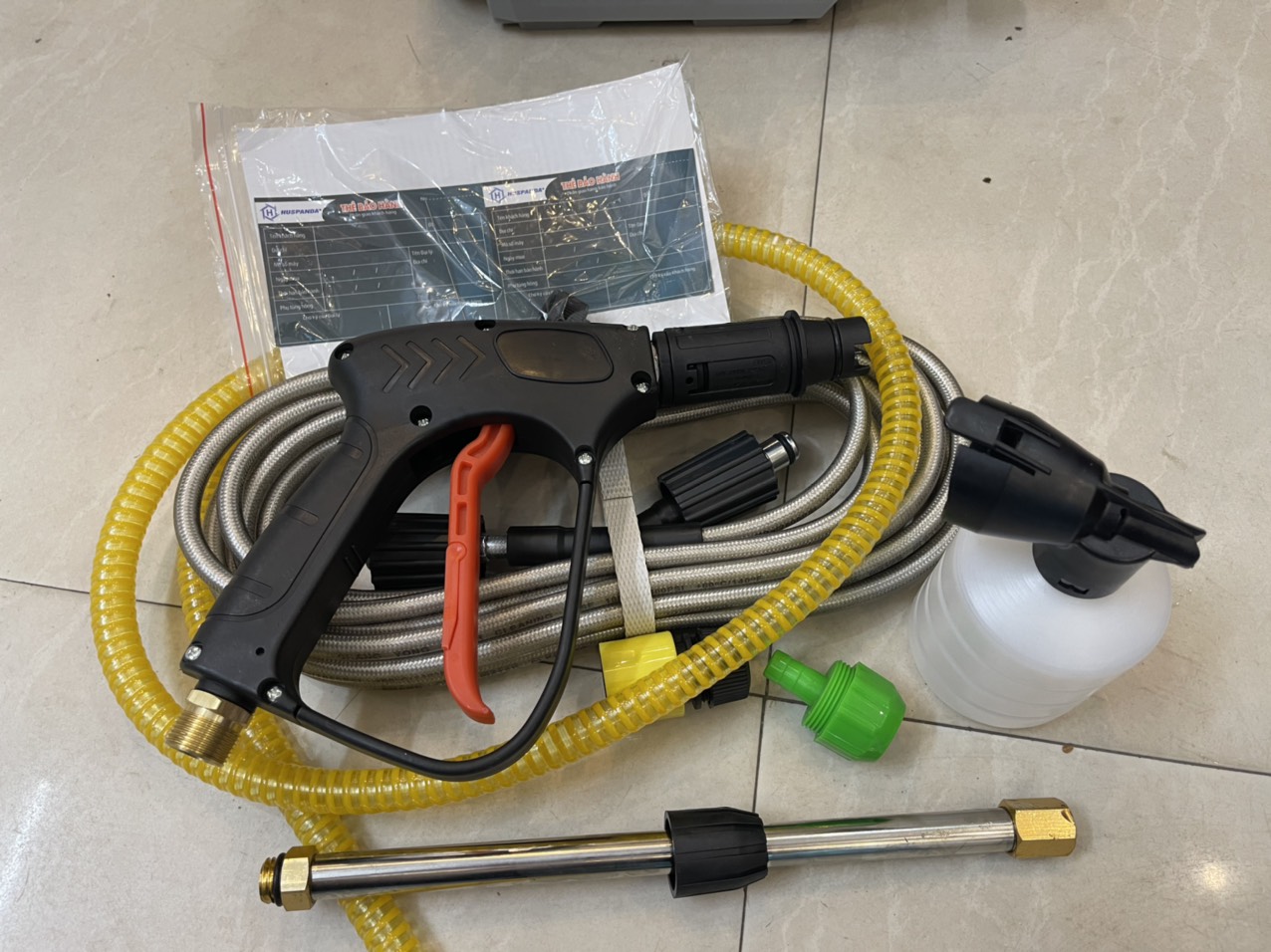 Phụ kiện bao gồm : lọc nước, dây hút 1.5m, dây áp lực 10m, súng, bình bọt. Với bộ phụ kiện đầy đủ bạn chỉ cần lắp đặt là có thể sử dụng luôn mà không cần phải mua thêm bất kỳ bộ phận nào khác.