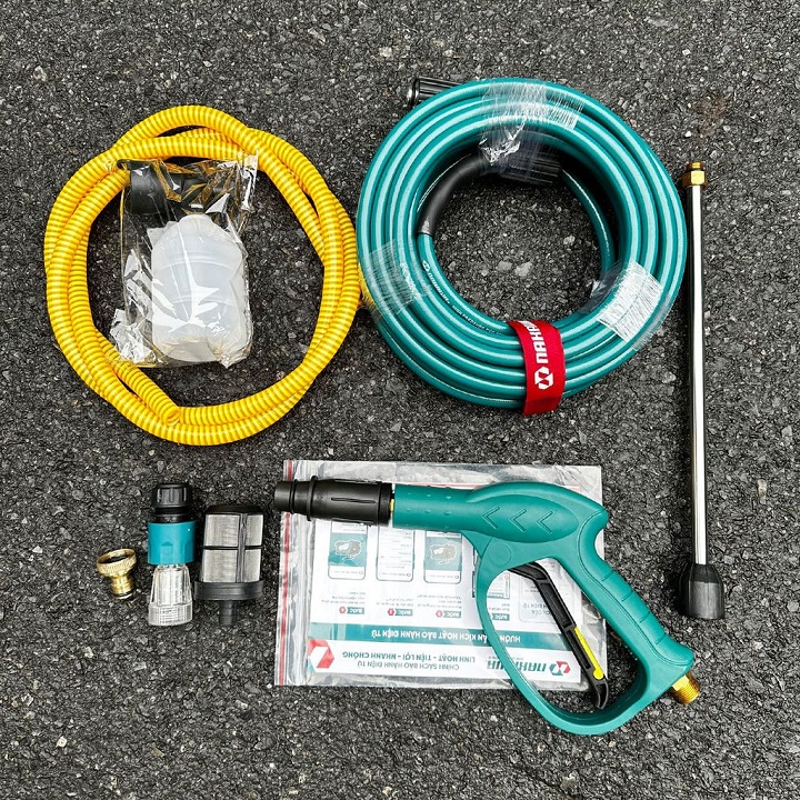 – Phụ kiện bao gồm: dây xịt áp lực 12m, dây hút nước đầu vào 2m, bình phun bọt tuyết, súng phun nước, thanh nối dài, kim thông nòng súng, chõ lọc rác, 2 đầu nối nhanh. Với bộ phụ kiện đầy đủ bạn chỉ cần lắp đặt là có thể sử dụng luôn mà không cần phải mua thêm bất kỳ bộ phận nào khác.