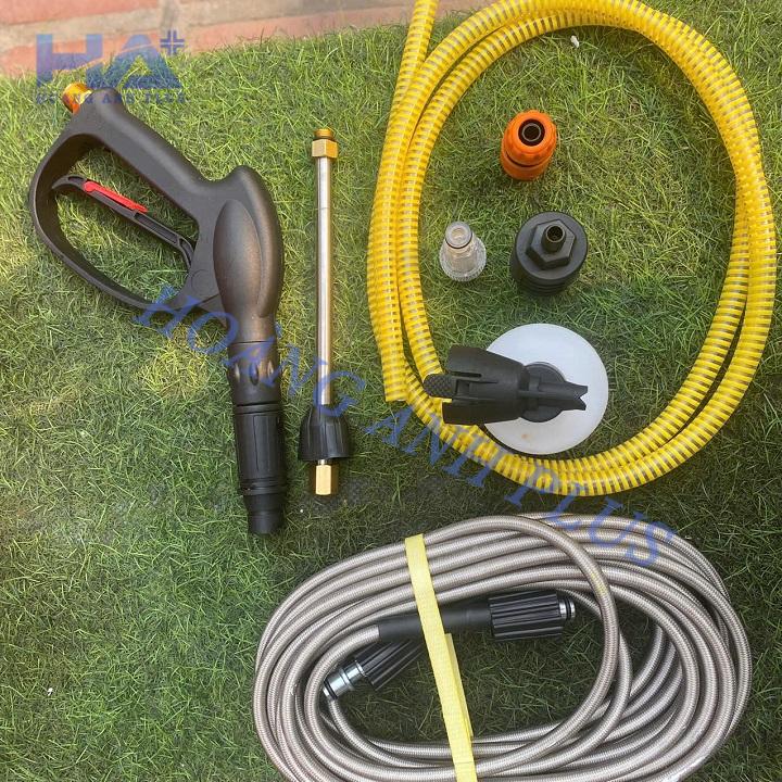 Phụ kiện bao gồm: lọc nước, dây hút 1.5m, dây áp lực 8m, súng, bình bọt. Với bộ phụ kiện đầy đủ bạn chỉ cần lắp đặt là có thể sử dụng luôn mà không cần phải mua thêm bất kỳ bộ phận nào khác.