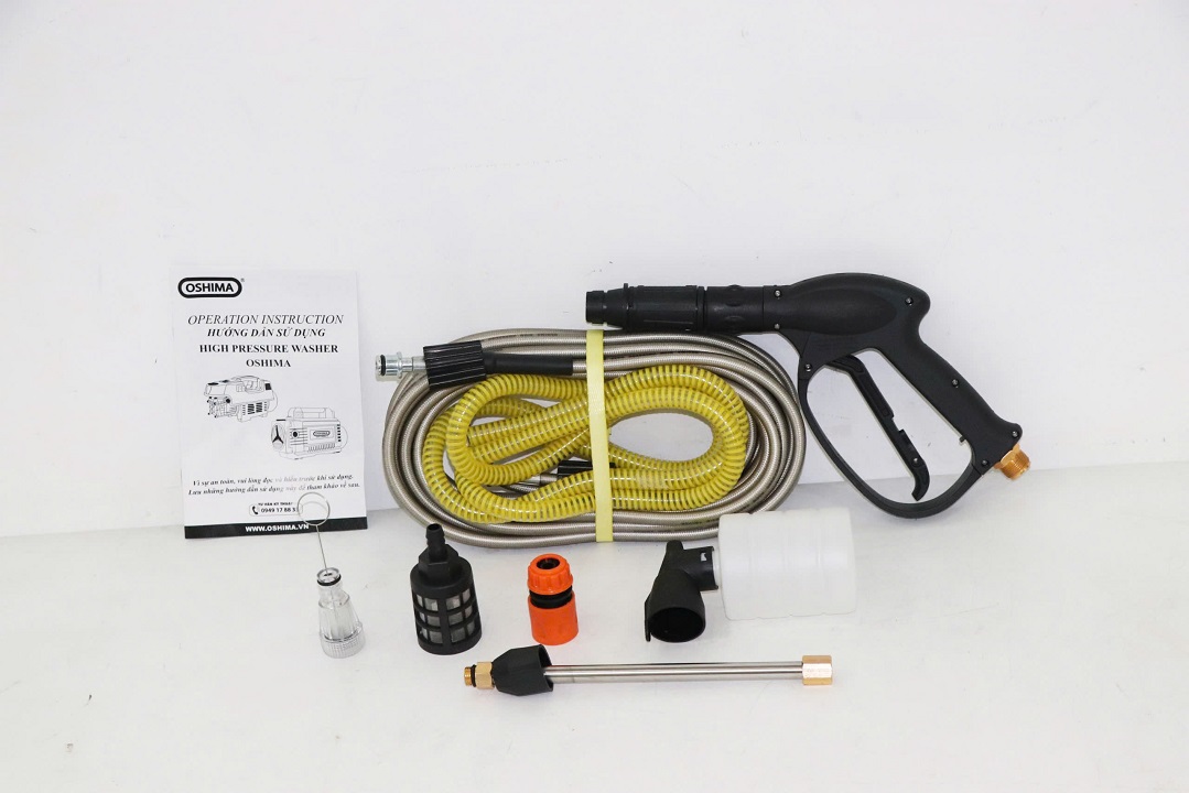 Phụ kiện bao gồm: lọc nước, dây hút 1.5m, dây áp lực 8m, súng, bình bọt. Với bộ phụ kiện đầy đủ bạn chỉ cần lắp đặt là có thể sử dụng luôn mà không cần phải mua thêm bất kỳ bộ phận nào khác.