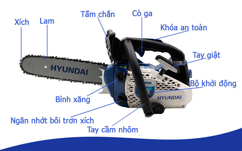Máy cưa xích được cấu tạo từ 7 bộ phận chính gồm: